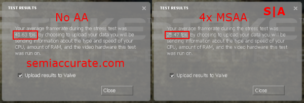 Our first game is Counter-Strike: Source. This game had a few notable problems when we tested it on the HD 4000, including a pop up window from Steam informing us that it’s database did not recognize our graphics adapter and text corruption when anti-aliasing was applied. These problems are also present when running the game on the HD 2000. But the text corruption issue is a moot point now because not only does the HD 2000 not support 8x MSAA (it only supports 4x MSAA) in Counter-Strike: Source like the HD 4000 did, it’s also not quite fast enough to run Counter-Strike with any anti-aliasing at all.