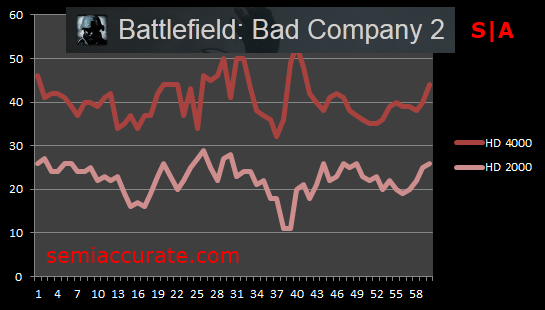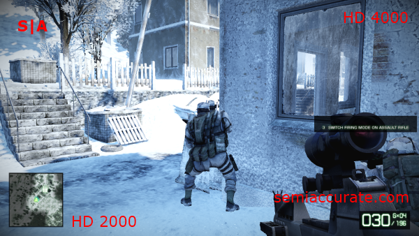 Looking at the side-by-side comparison here, we can see than there is a notable quality difference between our highest playable settings on the HD 2000, and the HD 4000. The biggest difference in quality, which you can’t actually see in these screen shots, was 2D trees that Bad Company used on the HD 2000 to cover the inaccessible hillsides of the in-game landscape.