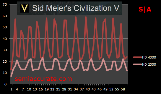 We’re seeing almost three times greater frame rates in Civ 5 with the HD 4000 than we were able to squeeze out of the HD 2000 at equivalent settings. Some of you may be wondering about the see saw pattern in frame rate in the graph above, this is due to us scrolling all the way in on the game map, the high points, and then scrolling all the way out from the game map, the low points. You do that too when you play, no?