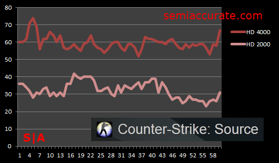 This graph shows a direct comparison between our contenders at the highest playable settings we found for the HD 2000. The HD 4000 is able to consistently deliver about double the performance of the HD 2000 in Counter-Strike: Source.
