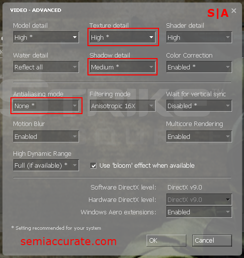 On the HD 4000 we were able to use 16x Anisotropic texture filtering, normal shadows, normal SSAO, and low FXAA, at a resolution of 1080P. The HD 2000 was only capable of running the game at about five frames per second at those settings. So I began to slowly tweak the graphical settings in this game down. I ended up turning all of the advanced features off, and setting texture filtering to its lowest quality option. I was also forced to drop the games resolution to 720P before I was getting playable frame rates without any input lag.