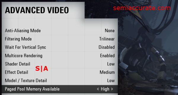 We were not unexpectedly forced to drop the graphical quality settings to almost their lowest pre-set. Initially we left the effect detail on high, but as more portals and lasers were added into the game our frame rates dropped from the low thirties and into the low twenties, which prompted us to drop that setting to its medium pre-set. Image quality was notably lower running at these settings on the HD 2000, but we were still able to find settings that made the game reasonably playable at 1080P.