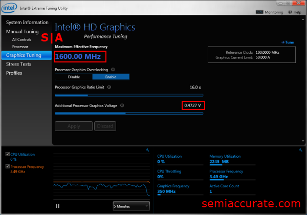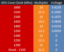 The maximum stable overclock I was able to achieve was 1600 Mhz. Increasing the clock speed to 1650 Mhz caused the HD 4000 to throttle after a few seconds no matter how much, or how much voltage we tried adding.