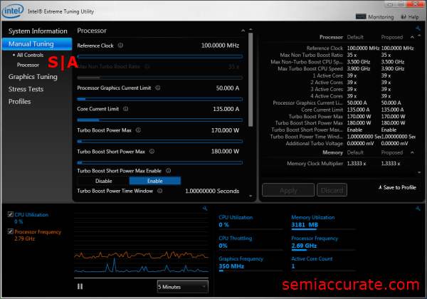 Looking at the controls on the Manual tuning page we see the all the different ways that Intel’s utility allows us to tweak our chip. Now most of the controls in the center of the window are about controlling the electric current and total power the CPU, GPU, and TurboBoost functions are allowed to use. Much like how modern high-end GPUs require users to change a PowerTune limit, Intel’s Ivy Bridge based chips require you to play with power consumption settings as well. Looking to the information panel on the right hand side of the window we can see all kinds of readouts like multipliers, turbo boost power caps, and clock speeds.
