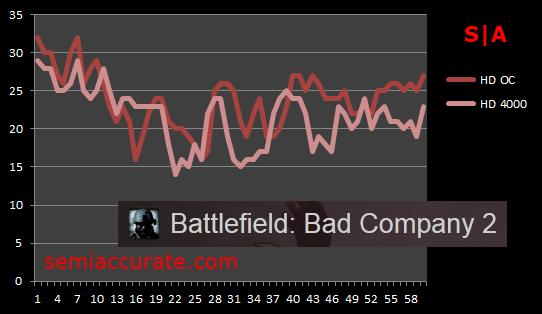 We recorded a 10 percent improvement in frame rates from stock speeds with our TDP capped overclock. This isn’t much an improvement to write home about, and a rather disappointing return on our 450 Mhz overclock. Moving to our non-TDP capped overclock we can see that our frame rates improved about 16 percent over stock. Again, this isn’t all that impressive considering how much additional voltage and clock speed we used to get to these results. At the same time though, our overclocking attempt moved frame rates in Bad Company 2 from the low-twenties up into the mid-twenties which is a perceptible improvement. But it’s not enough of an improvement to enable us to increase any of the game’s graphical quality settings and support playable frame rates.