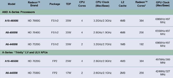 The models that are out today are the A10-4600M, A8-4500M, A6-4400M, A10-4655M, and A6-4455M. The first three are 35W, the 4655M is 25W, and the 4455M is 17W. A6’s are two cores, A8 and A10 models are four cores, and the lower wattages get LV and ULV tags for good measure. Base clocks range from 1.9 to 2.3GHz, and max turbo frequencies go from 2.6 to 3.2GHz. Similarly, shader counts come in three variants, 192, 256, and 384, basically three, four, and six VLIW4 64-shader arrays. Clocks on those range from 327-497MHz base and from 424-686MHz turbo.