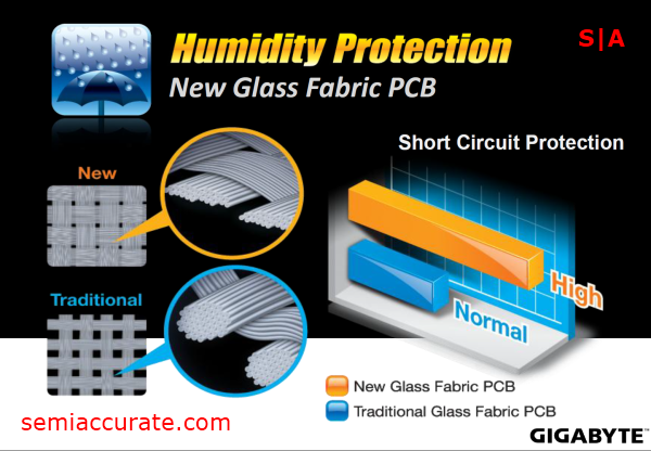 The first of these tenets is improved Humidity Protection enabled by Gigabyte’s new glass fabric PCB. Gigabyte has redesigned the weave of the glass fibers in their motherboard PCBs. By switching from a traditional glass fabric PCB, Gigabyte has achieved improved resistance to the negative effects of high humidity environments, like an increased chance of having a short circuit damage a motherboard.