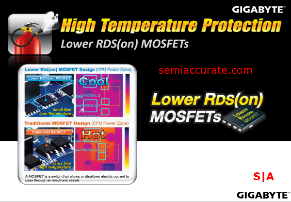 And here we are at the last of Gigabyte’s four Ultra Durable tenets, high temperature protection. In this case Gigabyte has opted to replace its traditional MOSFET design with a newer design that is both physically smaller and cooler than what they were using before. So hopefully this design will reduce the need for dedicated power circuitry cooling, which often makes mounting large heatsinks more difficult.