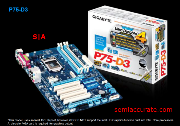 B75-D3V $ 78 B75M-D3H $ 80 B75M-D3V $78 P75-D3 $ 82So for about $80 you can have your choice of mid-range business oriented motherboards from Gigabyte. With reasonable pricing and the Ultra Durable 4 Classic feature set, it seems that Gigabyte has assembled a rather tantalizing value proposition with its B75 based line-up. Now the only question marks left are hovering over performance and Intel’s Small Business Advantage software. These are two items that we’re aiming to answer in an upcoming article.