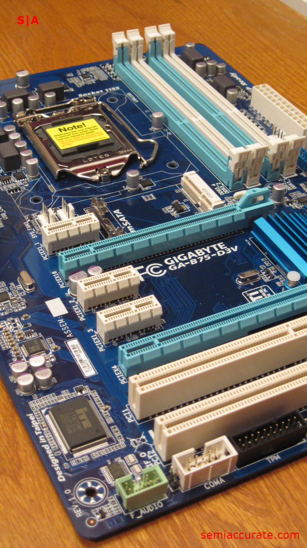 As you can see the B75-D3V is a pretty standard looking mid-range full ATX motherboard. Gigabyte has opted to configure the slot layout on this board to leave at least one slot of space between each of your dual-slot graphics cards should you choose to install two of them. This also means that if you decide one day that you want to drop a pair of triple slot graphics cards, like one of ASUS’s HD 7970 models, into this motherboard you’ll have all the room you need and an open PCI-E x1 slot to boot.