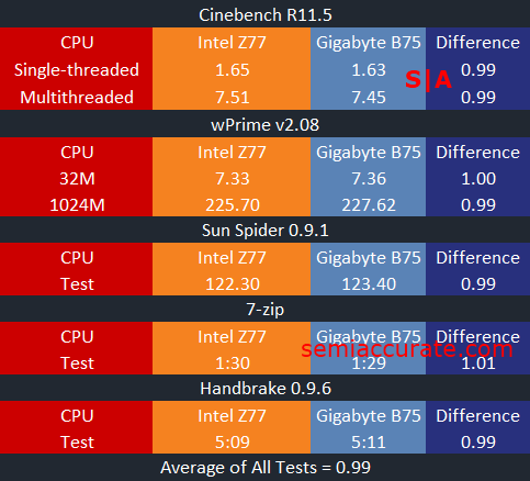 The performance loss incurred from using a B75 rather than a B77 based motherboards is, on average, less than one percent, which is within the margin of error for our testing. Basically, there is no difference in CPU performance between Intel’s $230 motherboard, and Gigabyte’s $80 motherboard. Make of that what you will, but we’re happy to see that Gigabyte’s motherboard can bring the full might of the Core i7-3770K to bear.