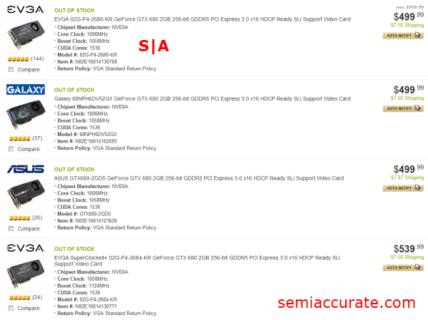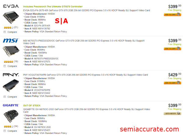 Looking here at Newegg’s GTX 670 page we can see that three of the eight SKUs offered are in stock.