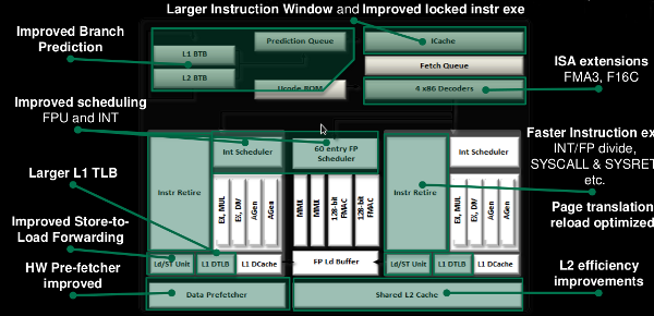 The first part of the core is one of the most important, the branch predictor. If you recall in our Bulldozer core article, that chip decoupled prediction logic from fetch logic, and used a two-stage, possibly more, prefetcher. These specifics still rate a ‘no-comment’ from AMD architects, but we don’t see any reason for this to have changed radically. It is listed as improved, not thrown out and completely redone.