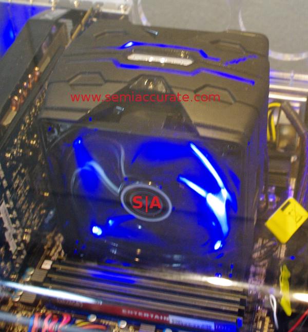 Once into their inner sanctum, also known as a booth, the first thing we saw was a new CPU cooler. Meet the first of the new Vapor-X coolers from Sapphire. There was a prototype shown off at previous shows, but this is the first production model the company has bandied about in public.
