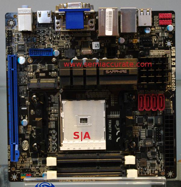 Next up we have two Trinity motherboards, the Pure Platinum A85XT MB is a full size board with two 16x PCIe slots. Sapphire won’t say what chip goes in to it, nor what chipset it sports, but if their naming convention holds, look for a tweaked A75 called A85. Feature wise, the A85 doesn’t seem to add much if anything, so don’t get your hopes up.