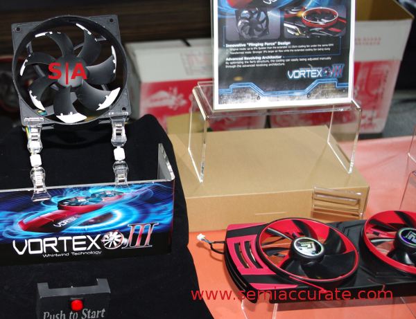 To take a hard left turn, Powercolor has two new fans, a production Vortex III and a concept part. The Vortex II was a device that allowed you to raise the height of the fan, basically trading one slot for extra cooling. It worked, but was a bit fidgety to deal with at times. The third iteration is much easier, with a little slider on the rim that allows you to set the height and therefor airflow with one finger.