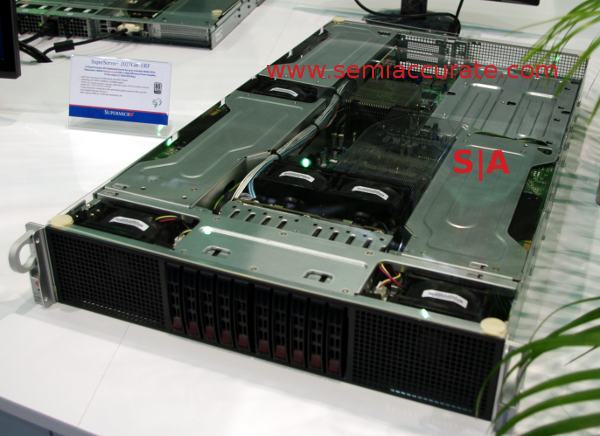 The first bit we saw at the booth was an update to their X9 blades that would take not one but two GPUs and two Sandy-EPs as well. This theoretically allows for 20 GPUs/7U, or 100 GPUs in a cabinet with 7U left over for a large block of dry ice to keep the metal shrouds from boiling off. If you are interested in actual computing rather than exercises in explaining to your boss why achievable FLOPS are so low, Supermicro also makes a 4S Sandy-EP blade too.