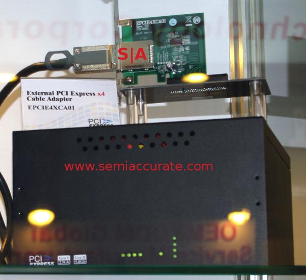 Need more than 10Gbps? With Thunderbolt, you can have 20Gbps, but not until 2014. If anyone still cares about Thunderbolt by then. With external PCIe2, you can buy it now, off the shelf. Yes, 40Gbps, 2m cables, and 75W of power, all available in quantity from IOI. Among others. The one pictured above uses two 4x cables, but IOI also has 8x lanes in a single cable should you prefer that.