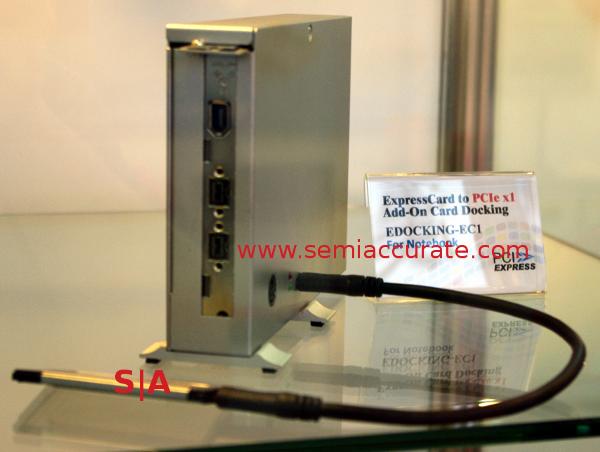 Laptop use you say? Thunderbolt works there. So does external PCIe, in this case, an ExpressCard to an external box with a PCIe 1x slot. This one is not PCIe2 or >1x because one PCIe 1x lane is all ExpressCard slots can deliver. That said, there is no reason you can’t route a 16x PCIe2 signal to an external port for the cost of a few mobo traces and jack. AMD did an 8x version several years ago, and it worked really well. Once again, standard, available, and better in every way than Thunderbolt.