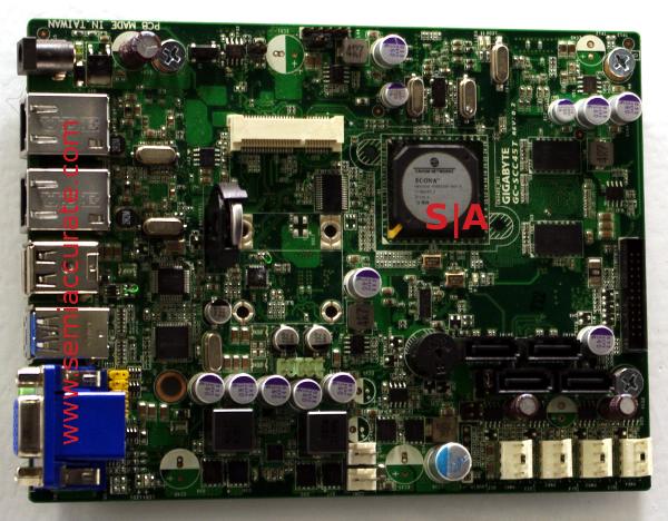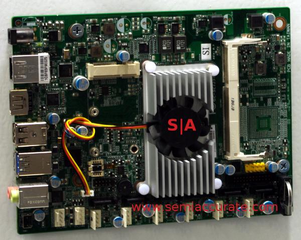Moving down the product stack we come to the SCI25T NAS board, basically a 32nm Atom in that odd shaped NAS box form factor. A small HSF, a DDR3 SO-DIMM, and enough fan headers to take flight, fast flight, are clues to its use. The documentation claimed 2x SATA 3Gb ports, but you can plainly see six in the picture, and there is an odd non-documented connector, plus DC in. This says it is a custom board for a embedded client who had some pretty specific needs.