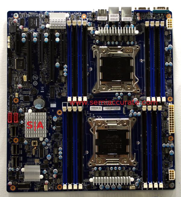 The first new one is the GA7-PESH1 Romley/E5-2600 board. It looks pretty ordinary at first, two sockets, 16 DIMM slots, and one south bridge. For drives, it has the normal 2x 6Gbps plus 4x 3Gbps SATA, and 8x SAS6, basically a fully equipped one IOH Romley. If you change the last 1 to a 2, you get two Intel 10GbE ports as well.