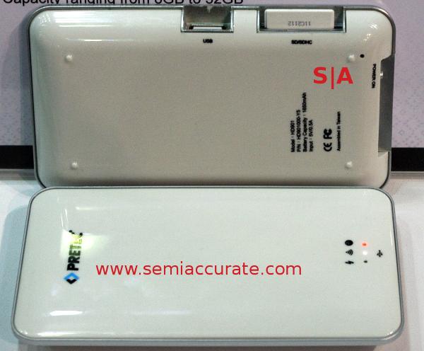 The first thing that we saw at the booth was the Wireless Storage System. Instead of the usual HD + Wi-Fi + battery in a plastic case, Pretec did something unusual. Contrary to what the name implies, the Wireless Storage System doesn’t actually have any storage, but it does have Wi-Fi and batteries, 1650mAh for a claimed 4 hours of use. It does however have an SDHC slot and a USB port, the idea is you can plug in whatever storage you want to use, and it becomes a wireless card/USB stick reader. The device also doubles as a normal USB2 card reader when you have it plugged in to charge. Neat, eh?