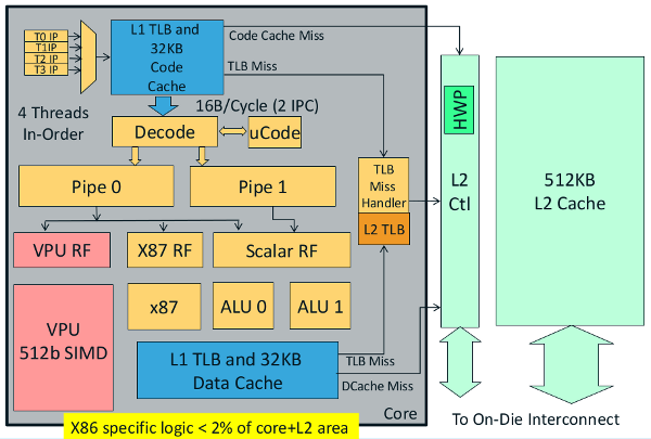 Each core is very similar to the older Intel Pentium, at least from an overview. It is a two pipe in-order superscalar design, but that is where the similarities end. The Pentium didn’t have four thread support, nor did it have a 512-bit vector engine bolted on to one of the pipes. If this doesn’t sound all that impressive, note the bit at the bottom of the diagram where it states, “X86 specific logic <2% of core+L2 area”. Making KC an x86 core rather than a specialized ISA has pretty tiny area drawbacks, especially since the cores do not make up all of the chip. Even with the rumored 500++mm^2 die area, 2% is not much to sacrifice to get free tools and a software base.