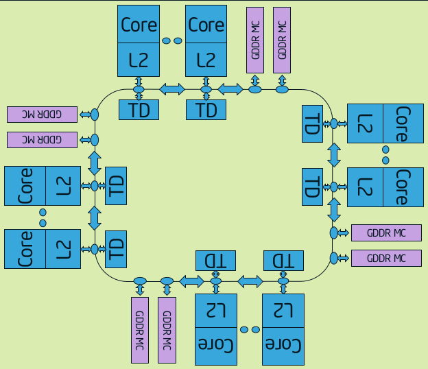 Most of these stops have a core, it’s associated L2 cache, and the tag directory (TD) at them. As we mentioned earlier, there are also stops for PCIe and GDDR5 controllers, plus a few more likely for housekeeping and background functions. Where Knights Corner really differs from Beckton is the arrangement of the cores and controllers. In KC, a group of memory controllers is physically associated with a fixed number of memory controllers. All cores can access all memory controllers, but this physical proximity can have some advantages for HPC workloads if done correctly.