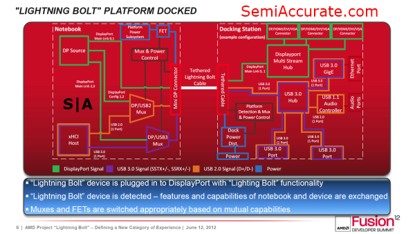 At the hardware level Lightning Bolt is a surprising simple, and driver-less, hardware capability that allows the USB 3.0 channels from the chipset and the DisplayPort channels from the APU to be routed over a cable and out to a hub.
