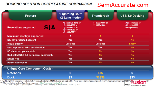 AMD was nice enough to put together the direct comparison table shown above. The key take away here is that Lightning Bolt offers a wider array of capabilities than its competitors for equal or less cost.