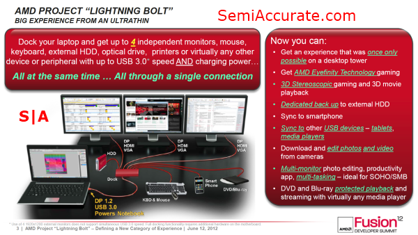 AMD’s Lightning Bolt is really a three part technology; one part capable laptops, one part capable cables, and one part specialized docking hubs. While this may sound like a lot of pieces, the advantages of having Lightning Bolt over a standard DisplayPort or even Thunderbolt are obvious. With only a single DisplayPort on a Lightning Bolt capable device, you can have access to a plethora of connectivity options ranging from Eyefinity to five USB 3.0 devices, and best of all you can use all of those options concurrently. This is why Lightning Bolt is a proposition that makes a lot of sense for tablets and Ultrabooks which lack the space necessary to offer a lot of ports.