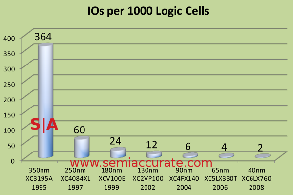 As you can see from the above slide presented at the Xilinx talk, the I/O count per 1000 logic cells has gone from 364:1000 to 2:1000 over the last 15 years. While each I/O may have gotten faster during that time, so has each logic cell. Modern chips, be they DSPs, SoCs, CPUs, or GPUs, are starved for I/O.