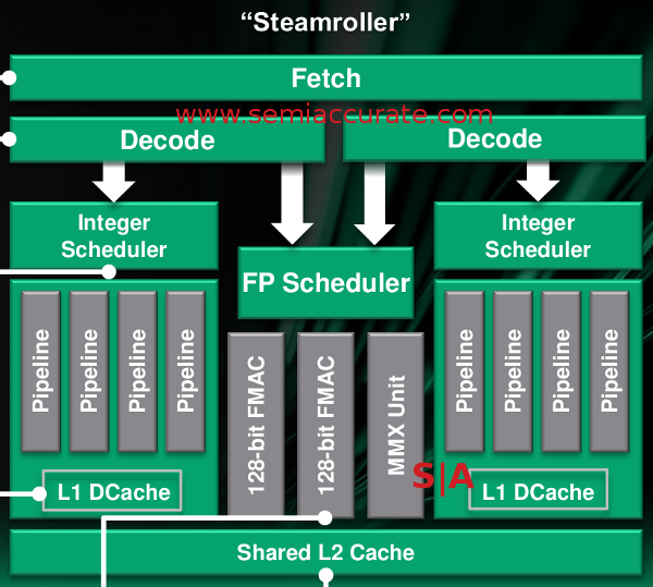 Back to the interesting stuff, the Steamroller. If you recall, AMD’s cores are named Bulldozer, Piledriver, Steamroller, and Excavator. Bulldozer is out on the market in FX and Opteron guises, and Piledriver came out as the core in Trinity. The next variant is Steamroller, and that won’t come out until either Kaveri or the 2013 Opterons/FX chips break cover. Bulldozer was a radical architectural change from the status quo, it had a shared front end, shared FPU, and two distinct integer units that were somehow called ‘cores’. Piledriver cleaned up a lot of what made Bulldozer underwhelm, but the fundamental problems that hamstrung Bulldozer didn’t go away.