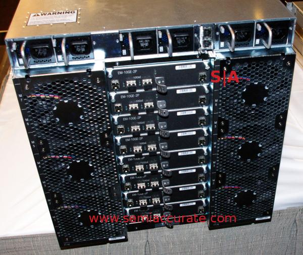 The box itself is new too, mandated by a new fabric. SM15000 has the same electrical connections, it has to to support the same cards, but the number of connections that make up the fabric is different. In SeaMicro terminology, this is extending the fabric outside of the box. Strictly technically speaking it doesn’t, the added torus width is there to put two SAS ports on each I/O blade. It looks like this.