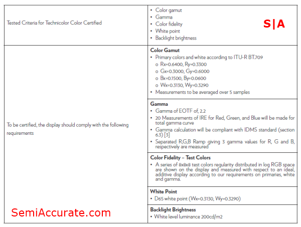 In order to license a Technicolor Color Certified logo the display must be able to meet the testing criteria shown in the table below.