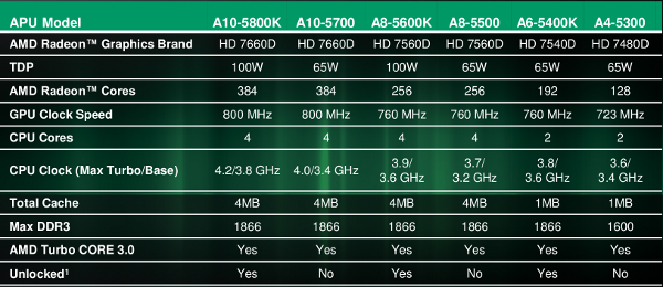 As you can see, clock speeds are way up on Trinity, with a low base frequency of 3.2GHz and a high of 3.8. Turbo goes up to 4.2GHz, a magic number it seems for Bulldozer and Piledriver cores, not sure why. Perhaps it is a speed path issue? GPU clocks are in a tight range from 723Mhz to 800MHz turbo, base clocks run at 633MHz for the K parts, 608MHz for the K-less SKUs. Shader counts range from a mere 128 to 384 leaving Trinity with quite the GPU performance spread, not so much on the CPU side.