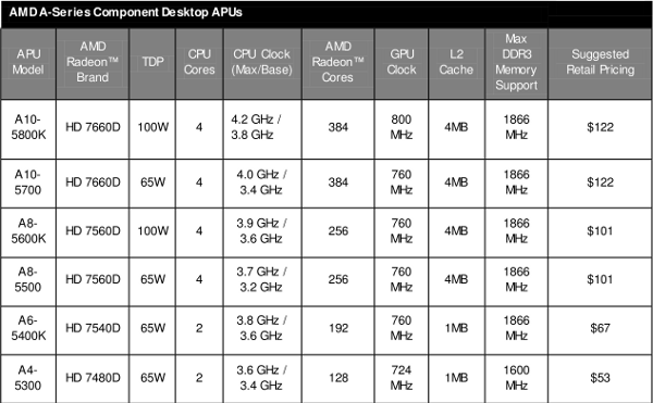 AMD is allowing us to release the final numbers on Trinity today, the price. With that, we present you the chart from last week as re-presented this week with one other column. This new chart has rendering errors, lacks color, and is turned 90 degrees from the last. If you are wondering why we are bitching, it is hard to make up a full paragraph for six numbers, only four of which are unique. Yay stupid embargo games.S|A