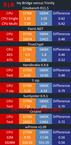 Assuming you had a choice between two equal priced Trinity and Ivy Bridge chips, the trades offs of picking one over the other are quite clear. If all you do is read SemiAccurate, render high resolution movies, then re-encode them to send to your iPad, then you should opt for an Ivy Bridge processor. Conversely, if all you do is read SemiAccurate and play Boarderlands 2 then you should chose Trinity. But either way you should definitely spend more time reading stories on SemiAccurate, and for that, both CPUs are overkill.S|A