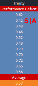 Let’s look at these benchmarks from another, hopefully more interesting, angle. If we average the difference in performance between the these two chips in terms of Trinity’s scores divided by Ivy Bridge’s, we can come up with a rather interesting data point.
