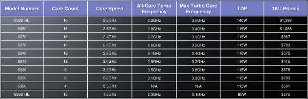 Today AMD released 10 CPUs with four to 16 cores, 1.8-3.5GHz base clocks, 3.8GHz top bin turbo on a few models, and a TDP of between 85 and 140W. Prices start at a mere $293 for the 4-core 6320 and go up to $1392 for the fastest part, the 16-core 6386SE. All have the same 4-channel DRAM as their Interlagos predecessors because, barring the cores, they are exactly the same as Interlagos. Here is the full specs in handy table form.