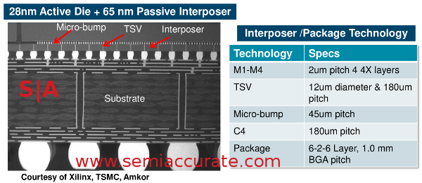 In their Virtex-7 HT FPGA, Xilinx uses all of this to do things that would be extremely difficult if not impossible to do in conventional ways. This device uses three FPGA dies and two dedicated SerDes dies on a single interposer. The FPGAs are on a process optimized for low power, the SerDes dies are built on another process that is more performance oriented, and all of it is mounted on a silicon interposer. Since that interposer is made from the same silicon as the dies, all of the wires can be made on a 65nm chip process and use 45µm microbumps vs 180µm C4 bumps to the substrate. Compare this to the 1mm pitch of the balls connecting it all to the to the PCB.
