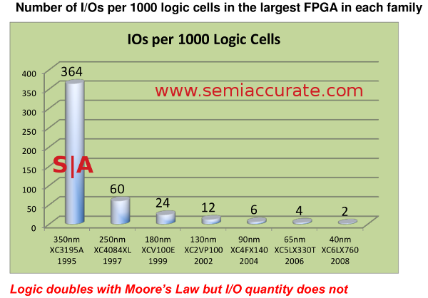 With this, the whole I/O:logic ratio as seen above moves much closer to the scaling curve defined by Moore’s Law than was possible before. The silicon on silicon nature of the interposer mitigates a lot of the thermal strain problems too, but assembly is much more problematic. That said, you can fit 16 times as many microbumps under a die as you can C4 bumps, I/O power drops proportionately, and you can make different dies on the most appropriate process instead of compromising all of it for a single large chip.