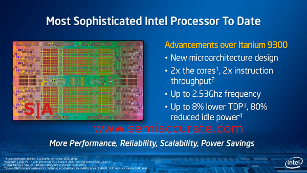 Intel continues it’s almost unbroken streak of dumbing down press briefings to the point that nothing but self congratulatory pablum is put out. Releasing technical information seems to now be a firing offense in Santa Clara, and no real questions are suffered. Itanium is still positioned as a viable product, I suppose some press are dumb enough to believe it, and we still seem to be at war with Oceania. One thing for sure is that Itanium is deader than ever, and this turkey won’t change a thing.S|A