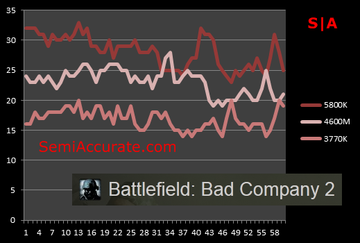 When it comes to Bad Company 2 the story is much the same. The 4600M is about 10 frames per second behind the 5800K, and the experience is just a little bit less fluid than what I would call playable. Dropping the effects quality down to medium would likely improve things quite a bit though.