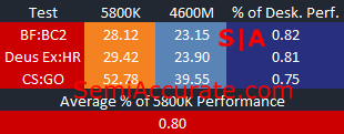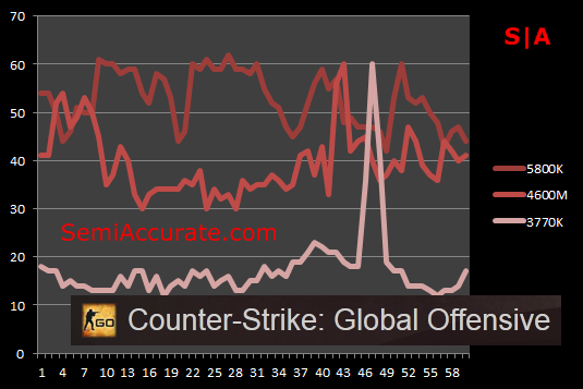 Counter-Strike is bringing up the rear here, and it’s a game that once again tells a very similar story compared to what we’ve heard up to this point. The performance of the 4600M varies from neck to neck with the 5800K, to about half the speed of it’s desktop counterpart. Despite this, both chips provided very playable experiences and it was hard to tell them apart.