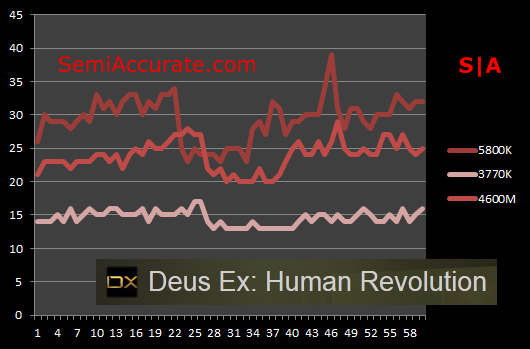 In our Deus Ex benchmark we can see that the 4600M is five to ten frames per second behind the 5800K, and while the 5800K offers a playable experience, in our testing it became clear that the 4600M offers borderline performance in this game. When it comes down to it, you’d really need to drop a setting or two for this game to be buttery smooth on the 4600M.