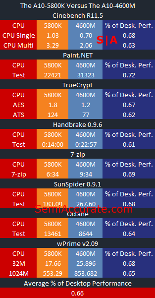 Now it’s important to note that this isn’t a perfect comparison. The A10-4600M and the A10-5800K are not socket compatible. But we did our best to put them both on as close to an equal footing as possible. We used the same 128GB Vertex 4 SSD for both systems, additionally both were equipped with 8 GBs of DDR3-1600Mhz RAM. The biggest difference between the two was the chip-set. The laptop based A10-4600M used an A55 based motherboard, and our desktop system used a A85 based motherboard. But at the end of the day what we are really comparing is AMD’s highest performance mobile APU platform to AMD’s highest performance desktop APU platform.