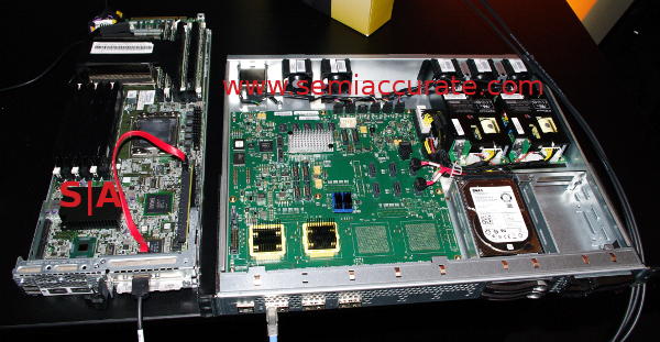 From the drives to the ROC, it looks like a normal RAID array. The FPGAs then break those out in to 12 SATA streams, so two FPGAs in the 24-port MX shown above, four in the 48-port version. From there, standard eSATA cables run to the back of every server in a rack, and the servers see them as a DAS device. The Syncro MX is essentially an eSATA boot drive for a full rack of servers.