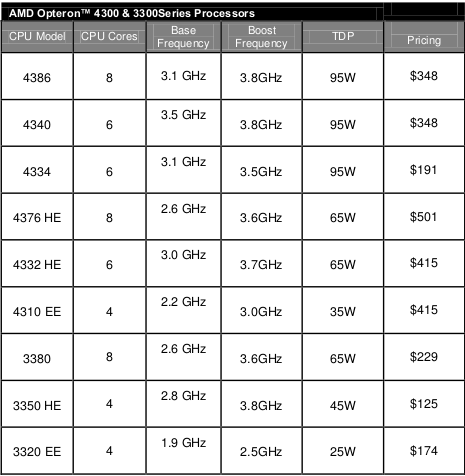 AMD is putting out two new server lines, the Opteron 3300 and 4300 families. There are nine chips in all being released, along with one new data point.