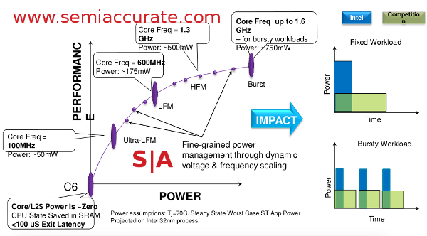 Last up, we have the power use curve. It is pretty standard, not to mention simplified, but being laid out like this gives you a pretty good idea why the whole HUGS (Hurry Up and Go to Sleep) concept is useful. Pick your points on the curve right and you can minimize power use for any given application. This chart leaves a lot to be desired for markings, but it gets the point across well. Speed up, get the job done, then drop to as deep an idle as possible. Every chip does it now, and this chart doesn’t just tell you why, it shows you.